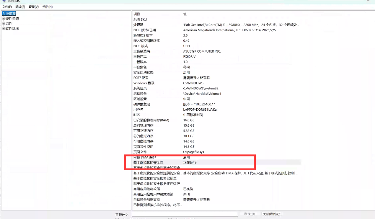 重启后重新查看系统信息,基于虚拟化的安全性显示未运行即为成功