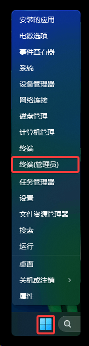 接着,右键开始菜单,并选择终端(管理员)(Windows 11)或 Windows PowerShell(管理员)(Windows 10)。