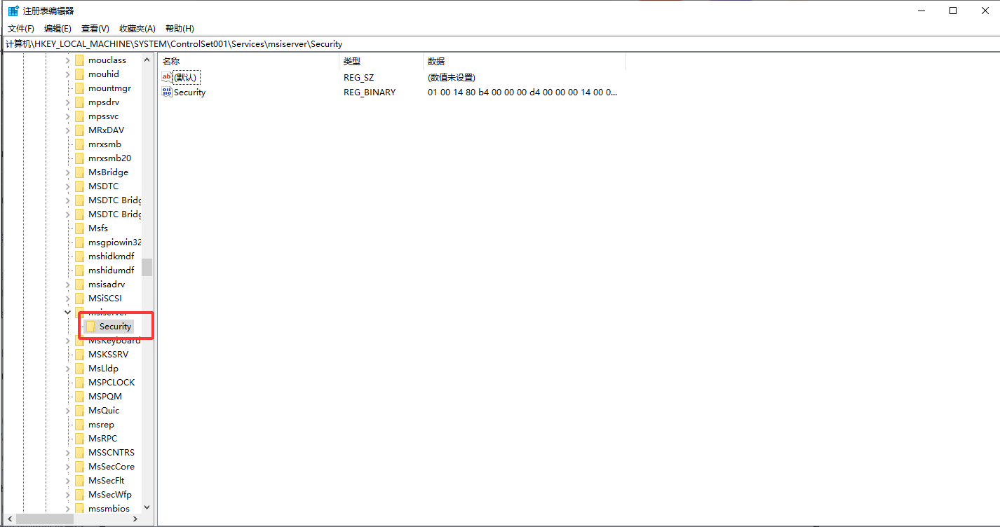 计算机\HKEY_LOCAL_MACHINE\SYSTEM\ControlSet001\Services\msiserver\Security将security文件夹删除